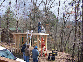 Monday after getting supplies, measuring and leveling, Bill, Tom, and Cliff building the floor. Temps dropped to 40's and raw.